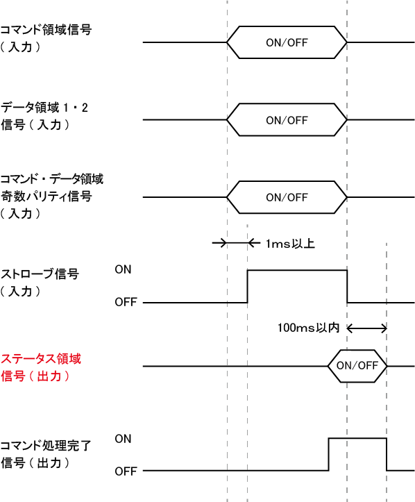 - コマンド処理完了前に、ストローブ信号がOFFしていた場合には、ステータス信号はいったん出力された後、100ms以内にOFF状態になります。