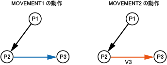 「MOVEMENT1」では絶対動作により、点P3へ移動しますが、「MOVEMENT2」では、現在位置P1からV3だけ相対移動します。
