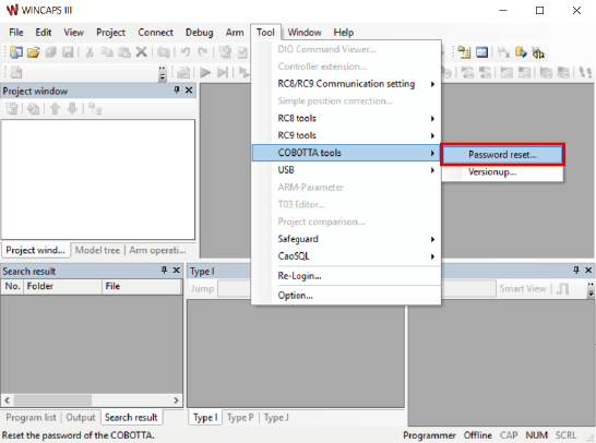 按下“工具”菜单的“COBOTTA工具”-“重置密码”。