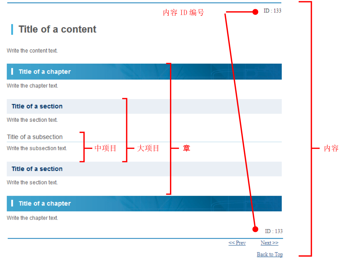 一般的内容由标题和正文组合而成,按层嵌入,例如内容的下层是章,章的下层是大项目,大项目的下层是中项目。
