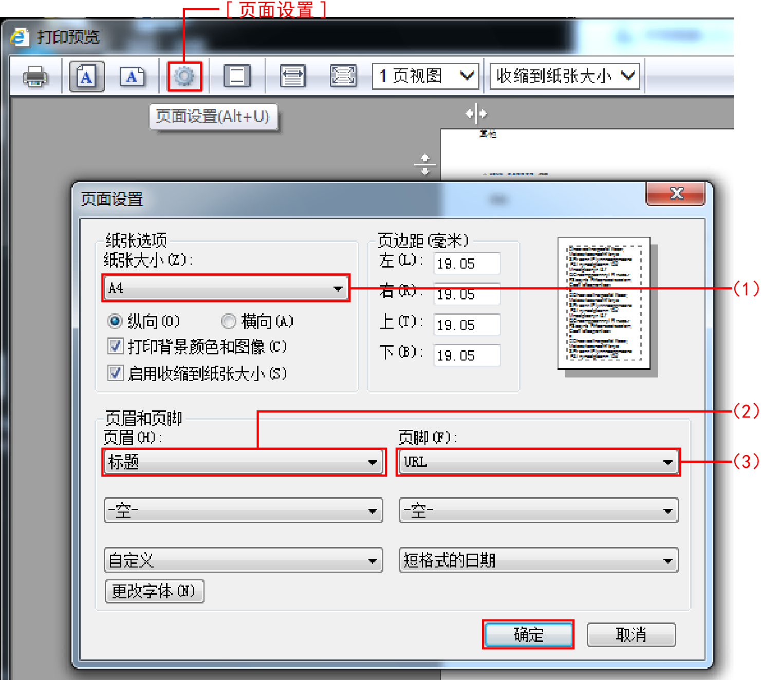 首次打印时,按“打印预览”对话框的[页面设置],进行以下的设定。