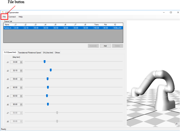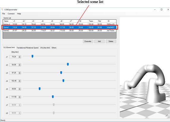 可以将速度限制功能的设定值及轴限制功能的设定值等只能用COBOTTA参数工具更改的设定值反映到模拟中。