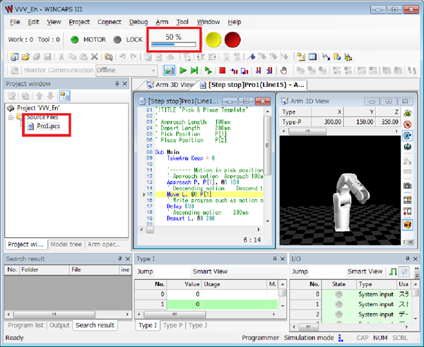 用WINCAPSIII打开保存的项目。在模拟模式下确认动作后,在反映用COBOTTA参数工具更改的值的状态下进行动作。