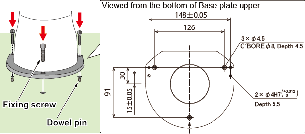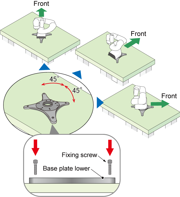 和用螺丝将上基础盖板固定以台架的方法一样,可以用固定用螺丝从上向下紧固。和只用上基础盖板固定到台架时不同,固定上下基础盖板时,可以按45°刻度选择3种模式的COBOTTA方向。