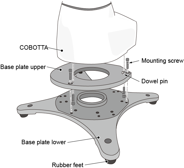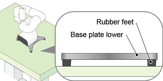 不将基础盖板固定在台架使用时,将带有橡胶脚垫状态的下基础盖板放到台架上。用螺丝将安装在COBOTTA的上基础盖板固定到下基础盖板使用。