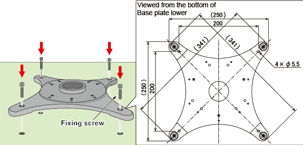 将下基础盖板固定到台架时,请拆下下基础盖板的橡胶脚垫。拆下橡胶脚垫后,用固定用螺丝固定到台架。