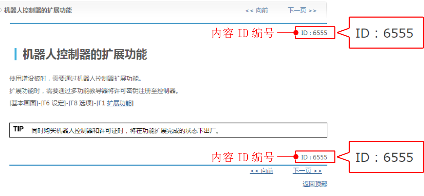 直接跳转到指定的内容ID编号的内容。内容ID编号被显示在各内容的右上方和右下方(参照下图)。