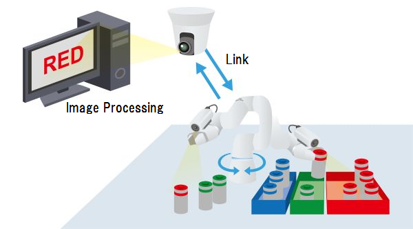 可轻松地利用COBOTTA的臂前端照相机(N10-W02)开始Pick & Place作业。并且还可以连接具备云台镜头及AF・AE等功能的网络相机,和臂前端照相机一样,可作为图像处理用照相机使用。