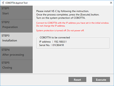 请勿在“COBOTTA AppinstTool”执行中拔掉连接COBOTTA的网线。