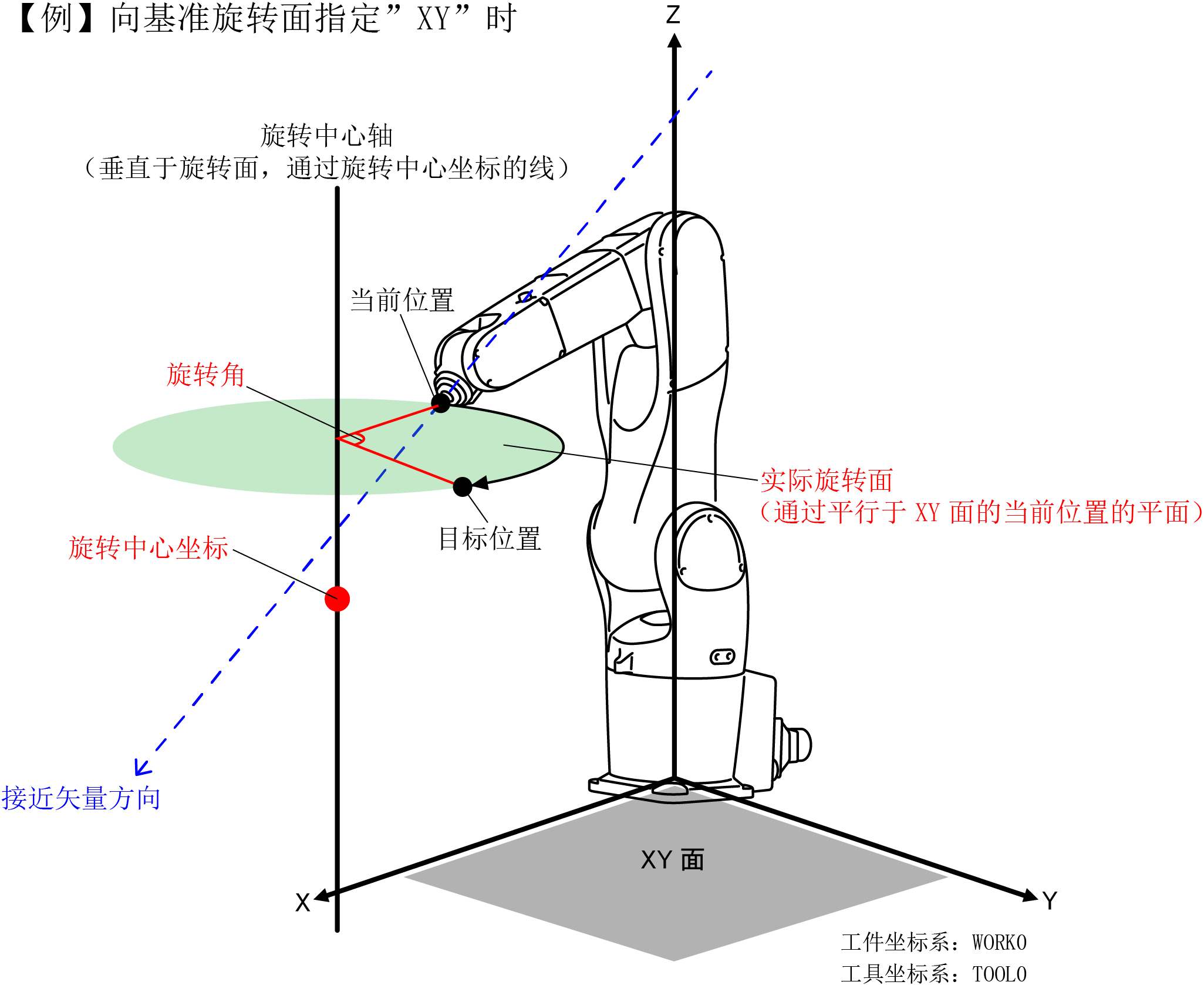 - 在当前的工具坐标系的X、Y、Z轴内,平行于2个轴创建的平面、通过当前位置的平面为实际旋转面。"“XYH”表示XY平面,“YZH”表示YZ平面,“ZXH”表示ZX平面。