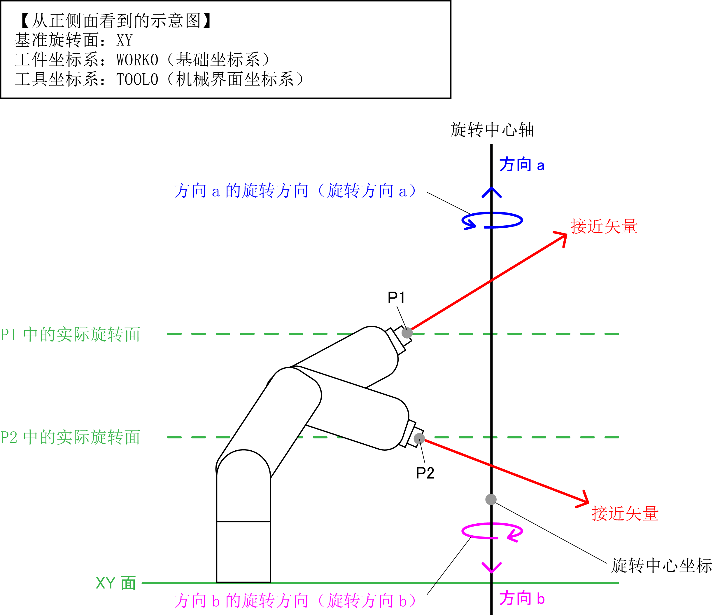旋转中心轴的矢量方向固定,与相对于实际旋转面的接近矢量的朝向无关。旋转中心轴的矢量方向取决于指定的基准旋转面。