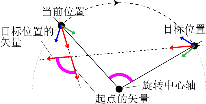 上图表示从实际旋转面的正上方看到的左图的示意图。 工具坐标系的各矢量以旋转中心轴为轴,仅旋转与指定的旋转角度相同的角度。 例如,使用接近矢量时,当前位置的接近矢量与目标位置的接近矢量构成的角度与指定的旋转角度相同。 |