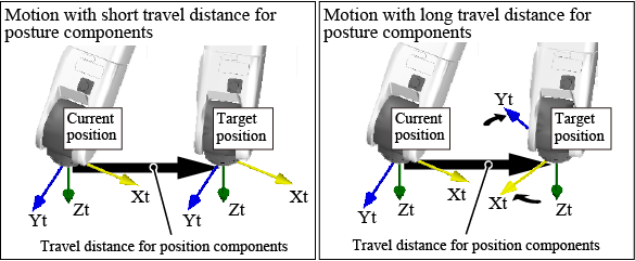 位置成分的动作时间即为实际的动作时间。但是,姿势成分的动作量大,即使将姿势成分的动作速度提高到上限,有时也可能也追不上位置成分的动作时间。此时,将姿势成分的动作速度提高至上限时的姿势成分动作时间即是实际的动作时间。