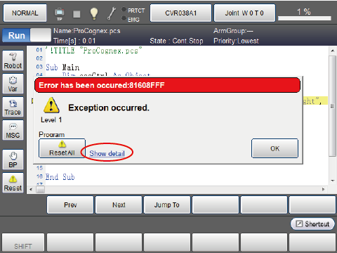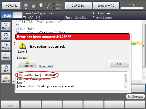 以下示例表示在In-Sight与COBOTTA未连接的状态下,执行使用Cognex In-Sight插件的程序时发生的通用错误。