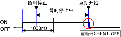 | 1 | 暂时停止中不关闭的模式 | 即使在暂时停止中经过时间也会计时,但在暂时停止中即使达到输出时间后也不会关闭。再次使任务动作时,关闭。