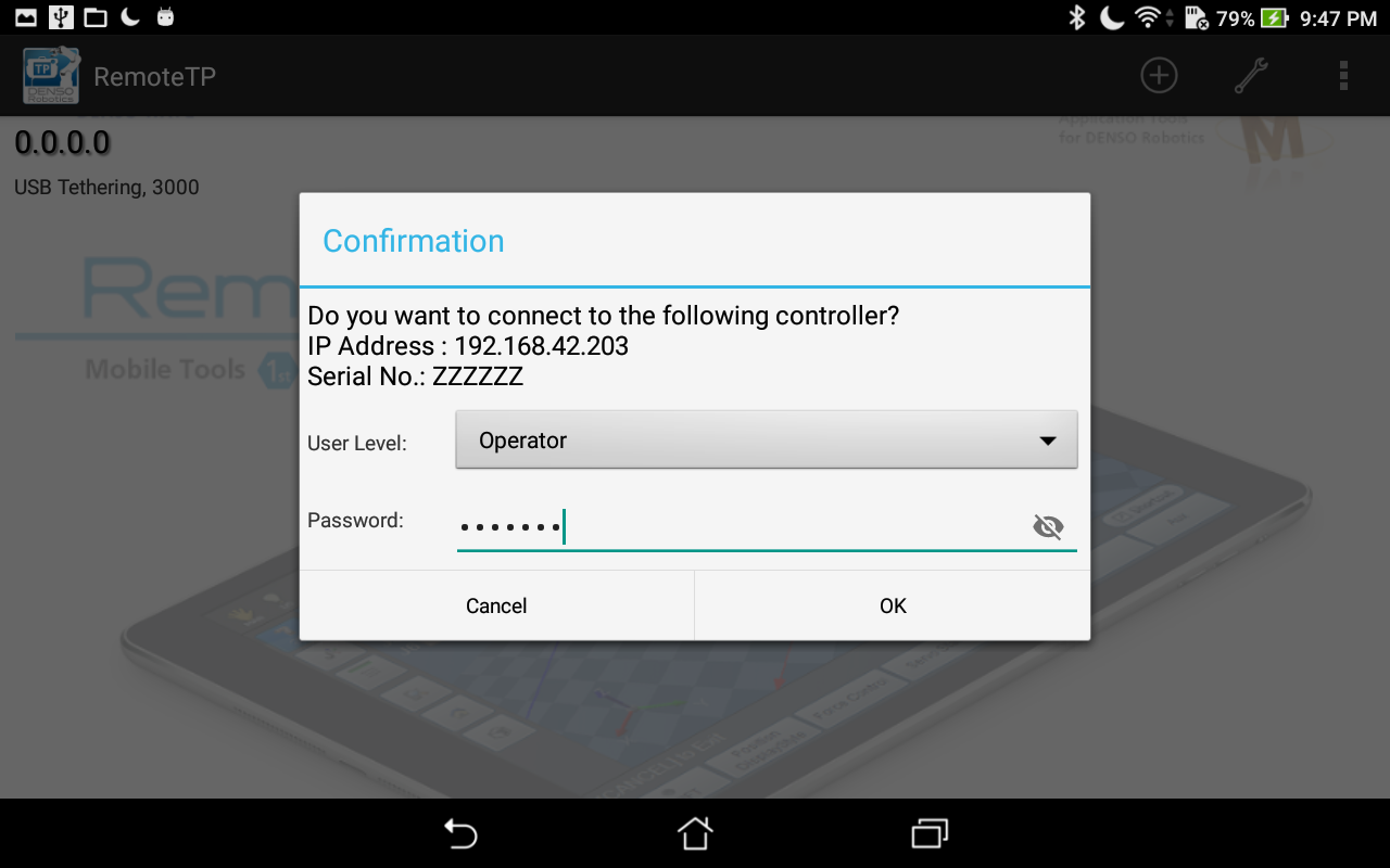 1. 用USB线连接COBOTTA和平板电脑(含曾连接的平板电脑)的状态下接通COBOTTA的电源时。 2. 平板电脑中显示以下任意设定视窗(有时也会不显示)。