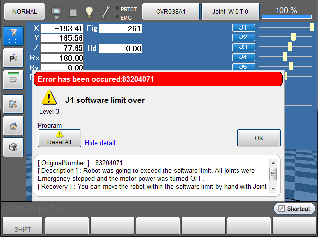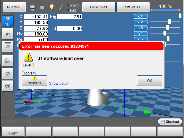 在机器人的操作、运行中,COBOTTA发生错误时,远程TP/虚拟TP画面上显示“错误编码表”中的错误编码和错误内容。 此外,错误处理后,通过按压错误讯息视窗上的OK按钮,可解除错误。 所有程序的清零操作可也在错误讯息视窗上进行。 下图表示错误讯息视窗显示示例。