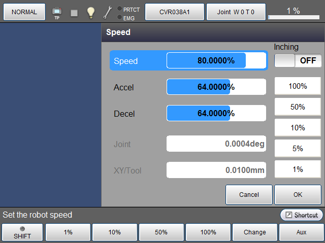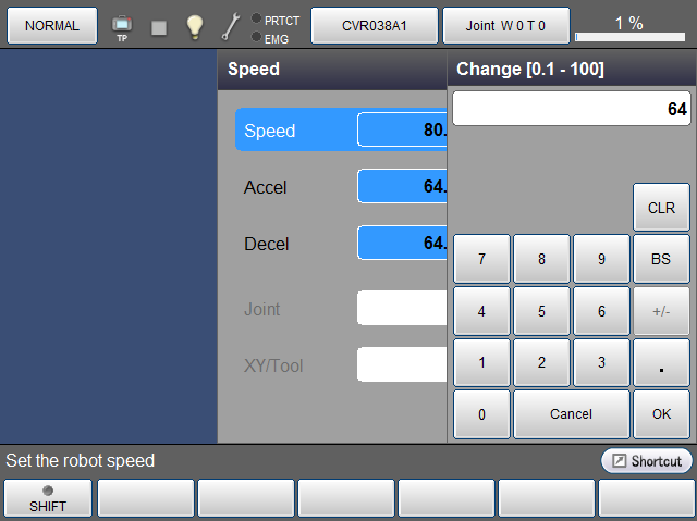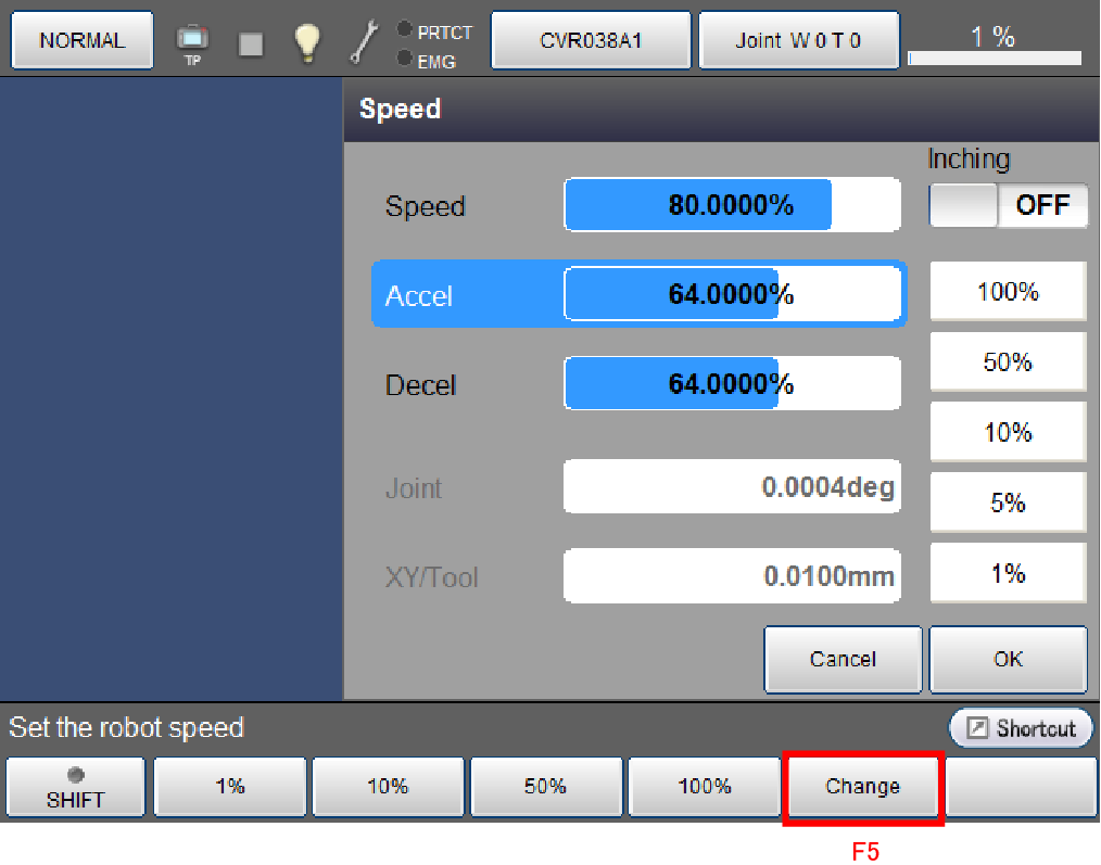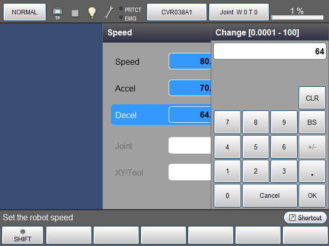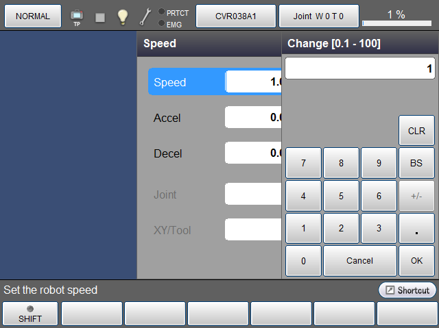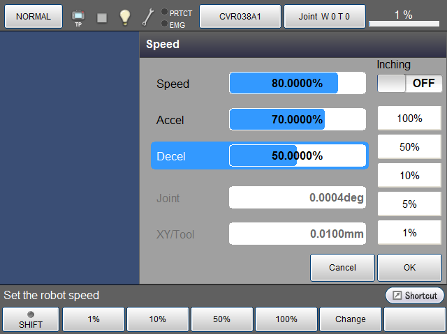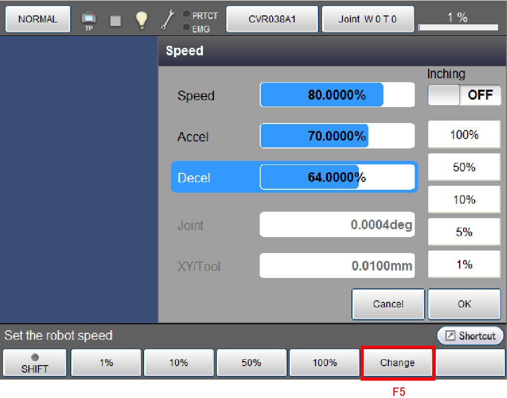 数字键消失,如下所示,加速度被新输入的数值更新。如要取消更新,请按压[Cancel]。画面返回至原画面。另外,此处如果按压[Cancel],则之前设定的外部速度也返回至更新前的状态。