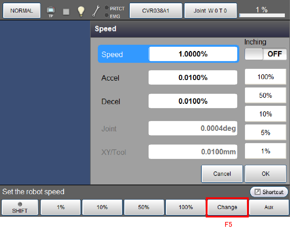 数字键消失,如下所示,外部速度被新输入的数值更新。如要取消更新,请按压[Cancel]。画面返回至原画面。