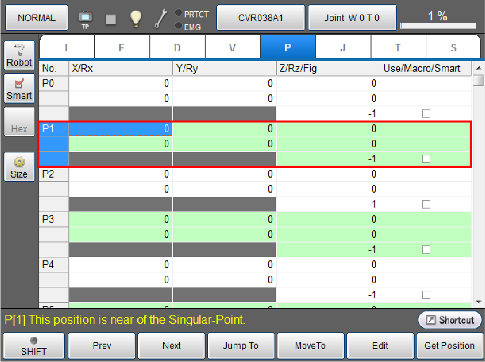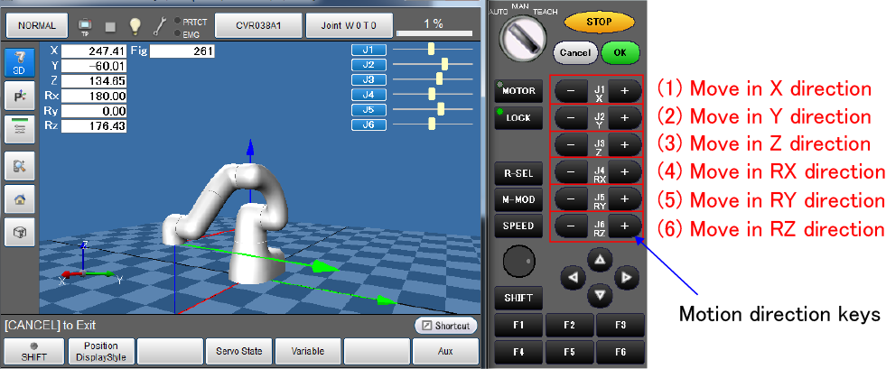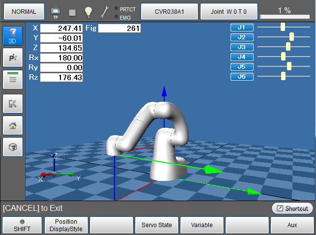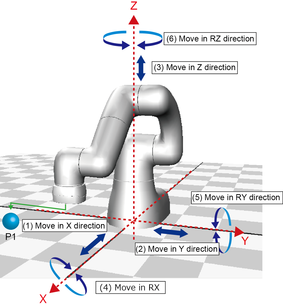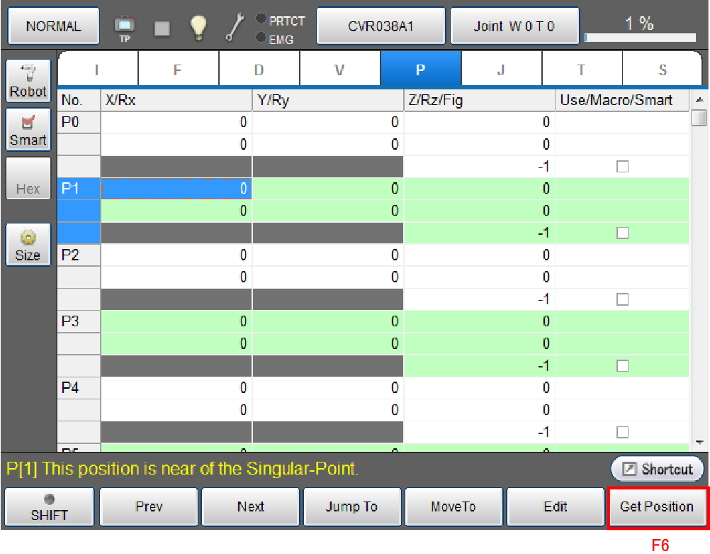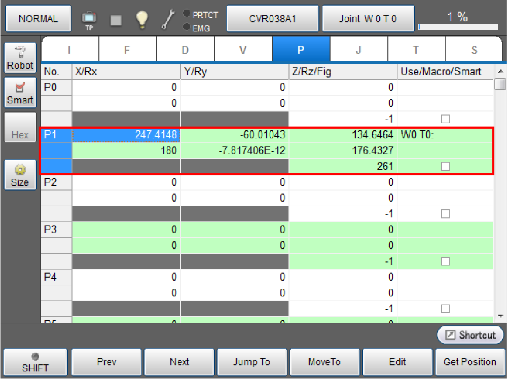 虚拟TP:适当按压键盘上的Shift键+移动方向键,将机器人移动至要在P1中设定的位置。