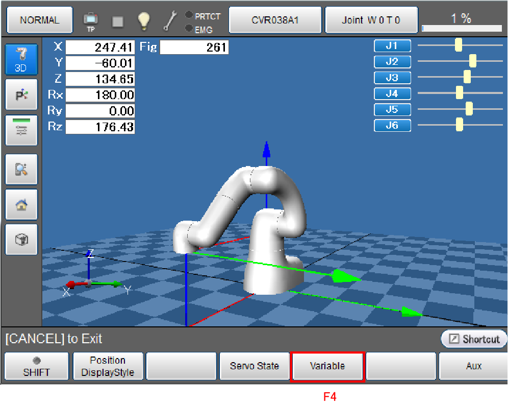 如果在远程TP/虚拟TP的初始画面上按压[F2 机械臂],则显示机械臂的各轴信息。