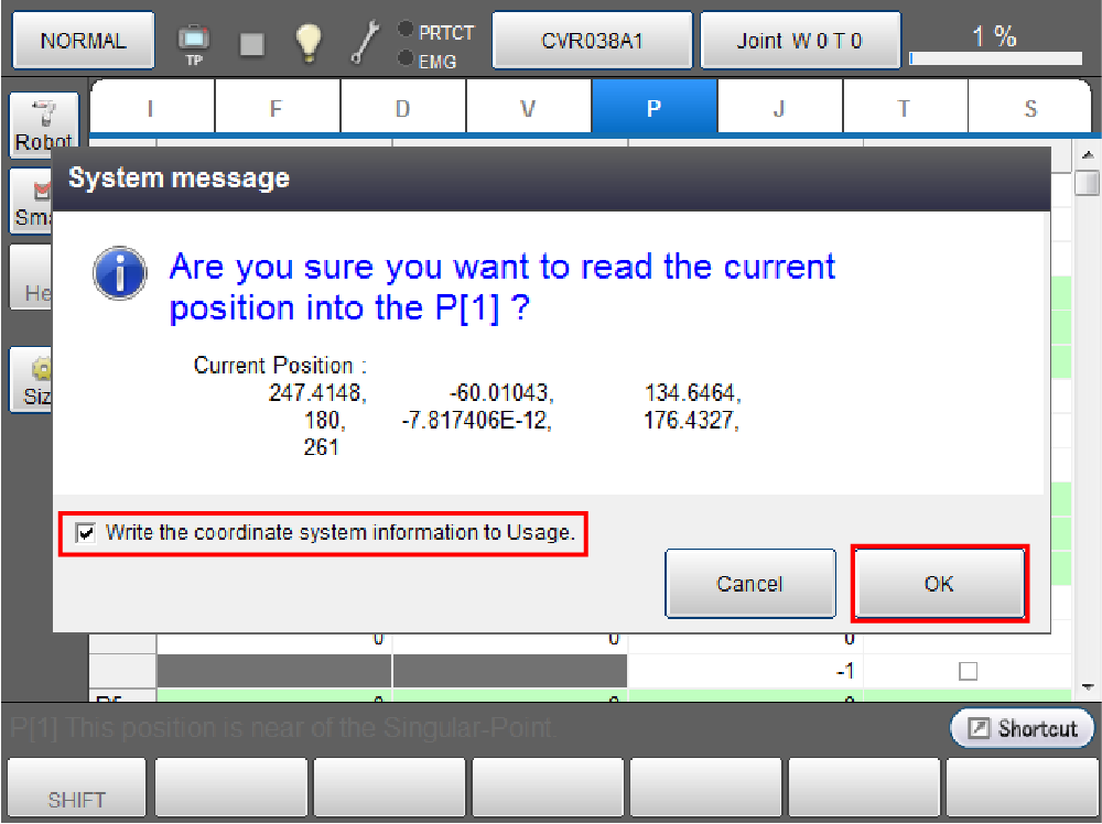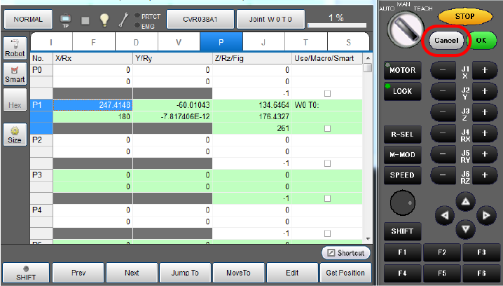 远程TP:适当按压动作许可按钮+移动方向键,将机器人移动至要在P1中设定的位置。