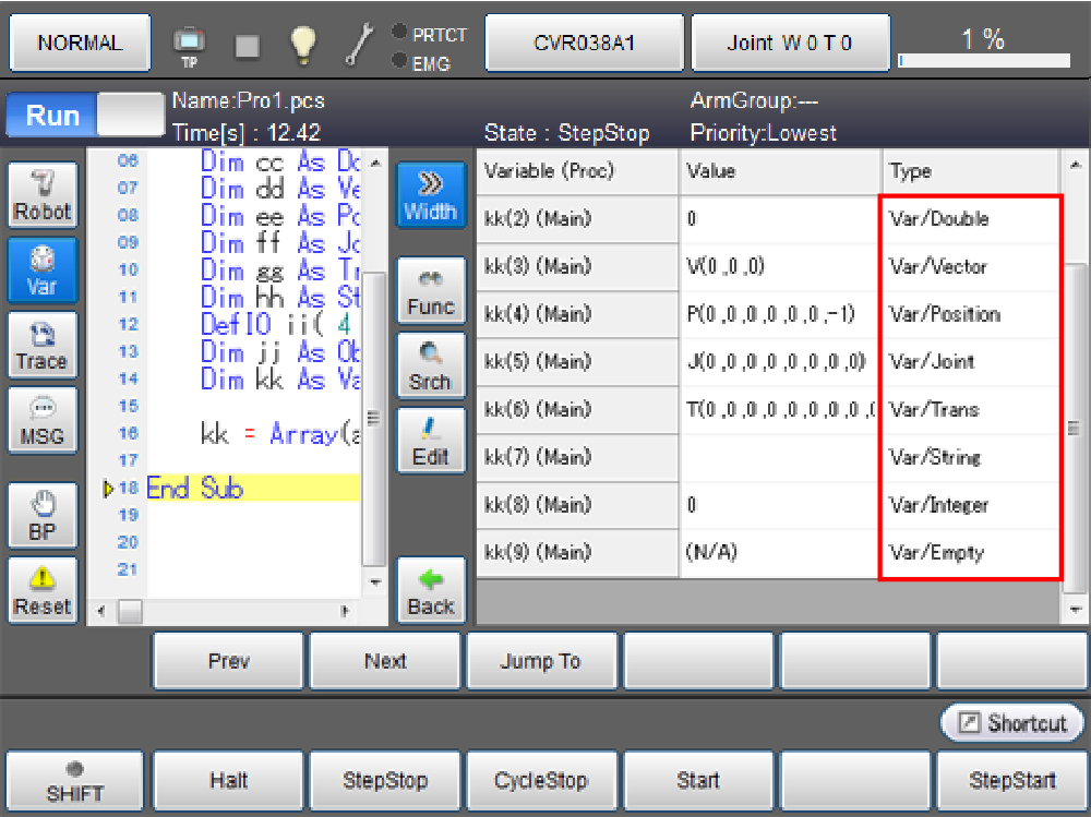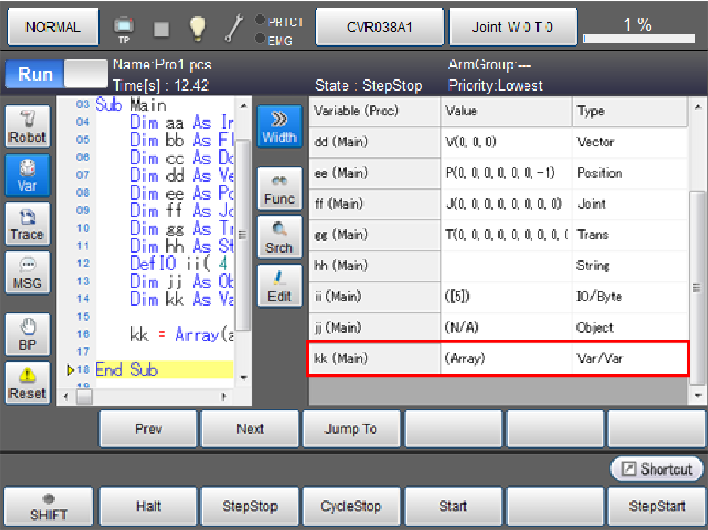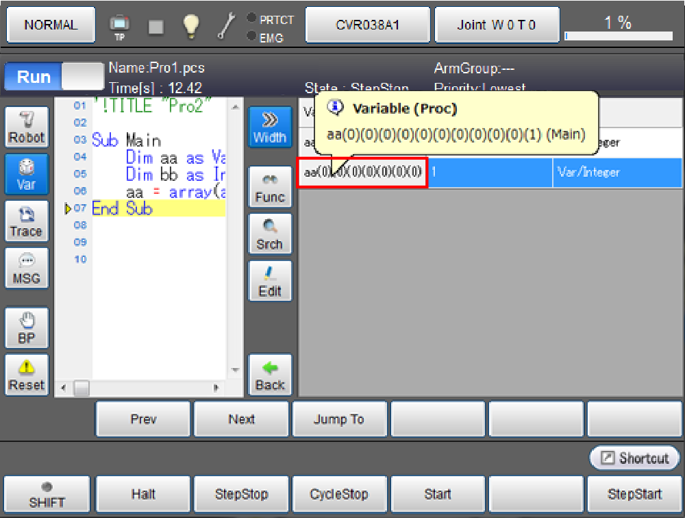 - 任务暂时停止中、步骤停止中、连续停止中时,显示值。 任务执行中、执行中(待机)、待机中、停止中时,Variant变量的值显示为(N/A)。