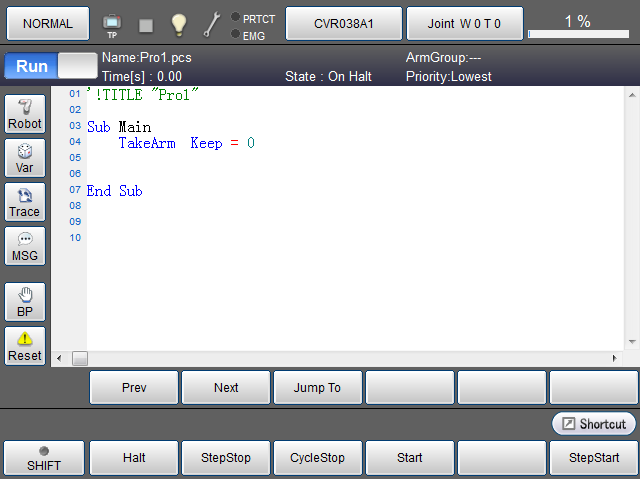 设定自动滚动条的ON/OFF。ON状态下,按钮的蓝色灯亮起。 通常自动滚动条为ON。在ON状态下,执行程序时,编辑器的光标追踪至执行行并在画面上显示执行行。可在画面上确认执行至何处。 设定为OFF的状态下,执行程序时,可在显示文件内自由移动编辑器的光标。可显示需要确认的行。 注1:设定为OFF期间,不能切换显示的文件。 注2:如果重启COBOTTA,则返回ON状态。 |