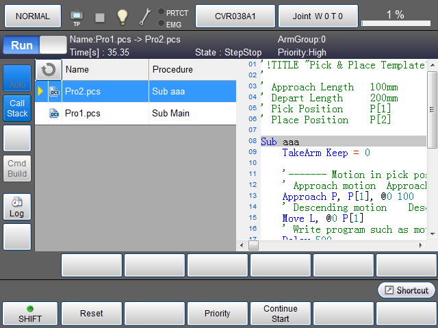 依次显示Call源的文件名(pcs, pns, h文件)。最下层为最初的Call源,箭头所标识的文件名为当前执行中的文件。如果触摸文件名,会在右侧显示该文件的源代码。