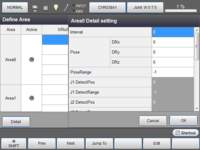操作路径:[F2 机械臂]-[F6 辅助功能]-[F5 区域]-[F7 详细]