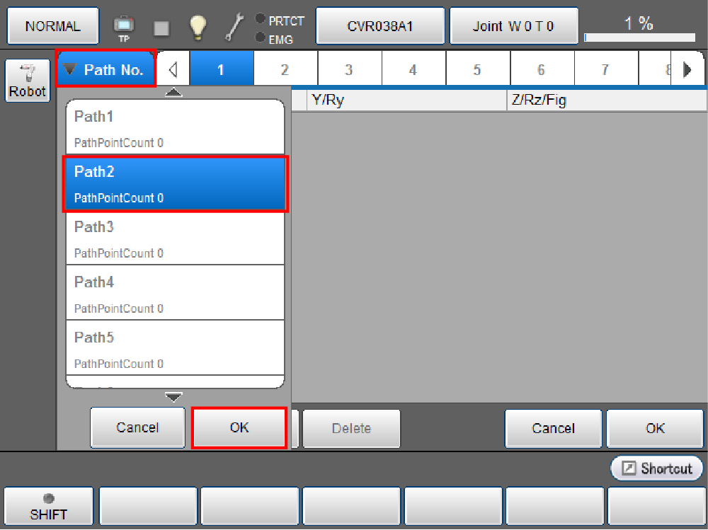 在显示出来的“路径点设定画面”中按压[路径编号],从列表中选择需要设定的路径编号,按压[OK]。