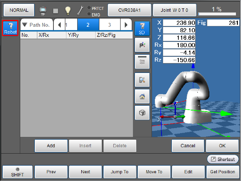 按下[Robot],在画面的右侧显示出机器人的当前位置信息。