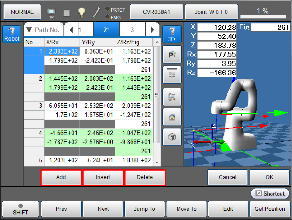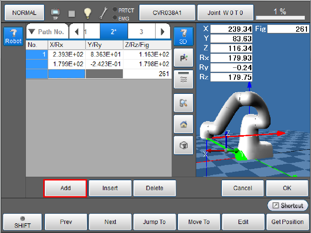 除上述内容以外,将动作模式切换为直接模式,然后移动到目标位置后,通过按压机械臂上的功能键也可追加当前位置。