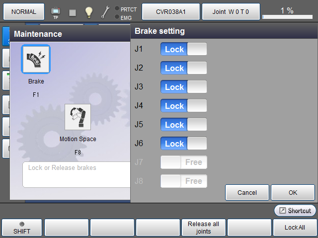 按压此键,所有轴的制动器都会显示为Lock。 之后按压[OK]会锁定所有轴的制动器。但是,如果机器人的轴无制动器,则不含制动器的轴均显示为Free。 |
