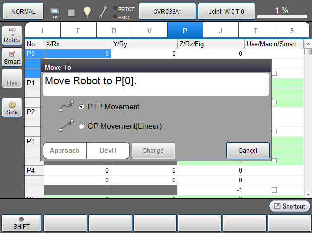 在机器人向目标坐标值移动中,可以选择用“PTP动作”移动或用“CP动作(直线)”来移动。