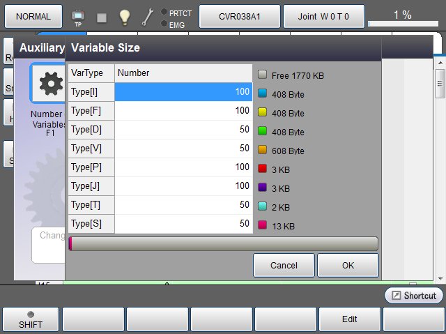 选择进行使用数设定的变量后按压[编辑],则显示数字键。 使用数字键输入设定值后按[OK],则使用数发生变更。通过按压[变量使用数]视窗中的[OK]键,确定变更后的值。
