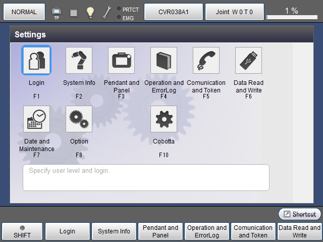 | [F2 系统信息] | 显示软件版本和运转时间等COBOTTA的信息。 用标签切换“一般”、“机器人”、“控制器”的信息。 |