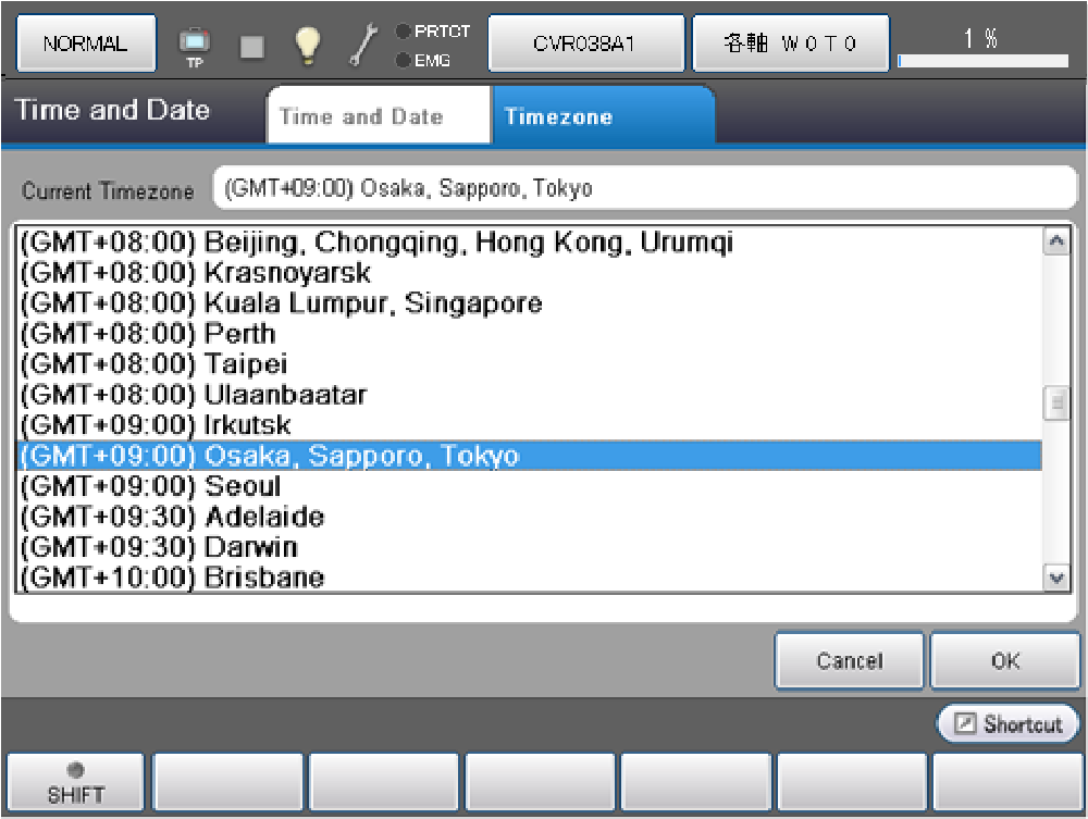 设定当前的时间区。 依次按压[F1 日期设定]和[时间区]标签后,显示以下[设定时间区]视窗。 也可使用远程TP/虚拟TP的上下方向光标键,显示、选择设定的时区。选择后按压[OK],则完成时间区的设定。