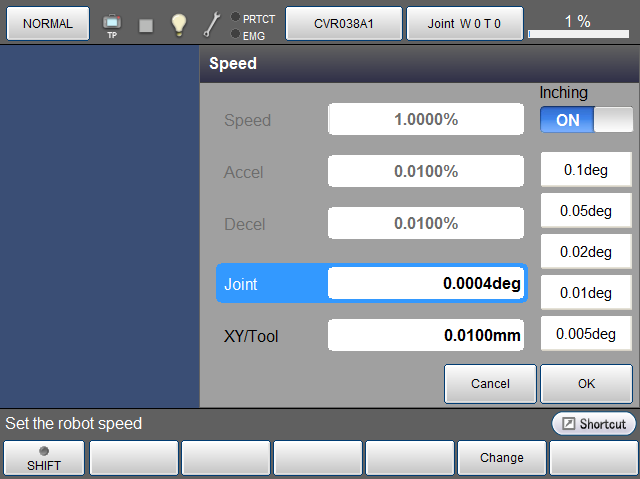 可通过远程TP/虚拟TP的左右光标键变更速度的值,此时“各轴:每次0.0025度、XY/TOOL:每次0.05mm”进行变化。