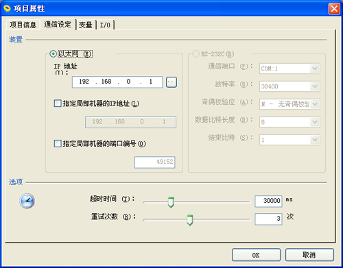 显示选择了“项目属性”对话框的“通信设定”标签的状态的画面。