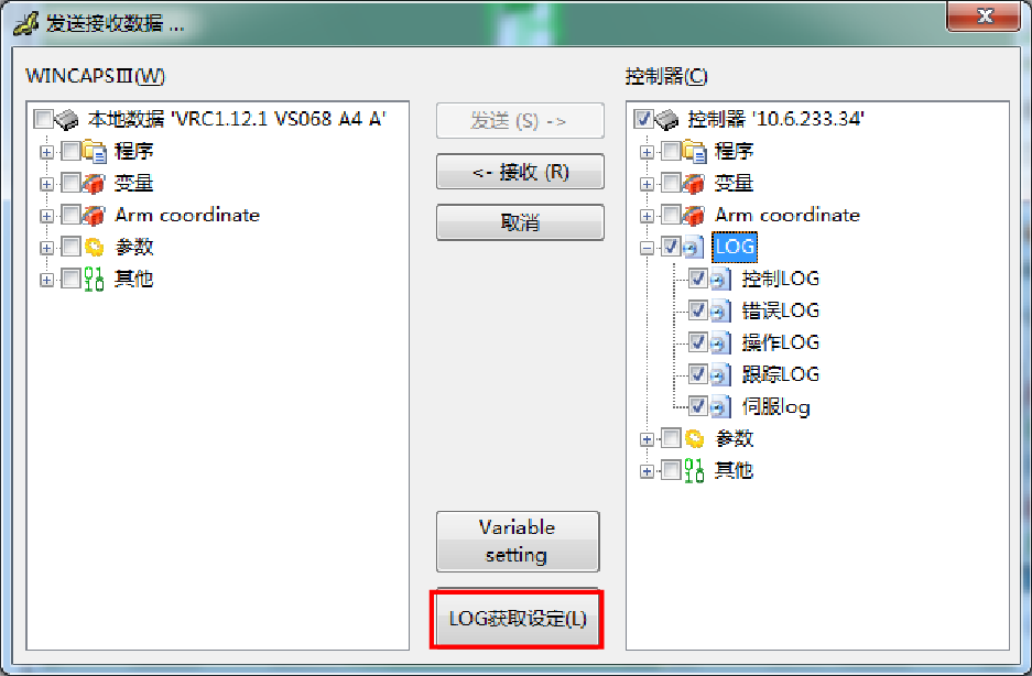 选择要取得的Log的存储区域(保存用存储器或者作业用存储器)。 COBOTTA的存储区域请参照TP应用操作指南的“控制Log的获取、显示、保存”。