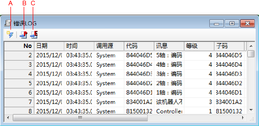 COBOTTA中发生的错误记录。记录最近的1,000个错误。数据保存在保存用存储器上。