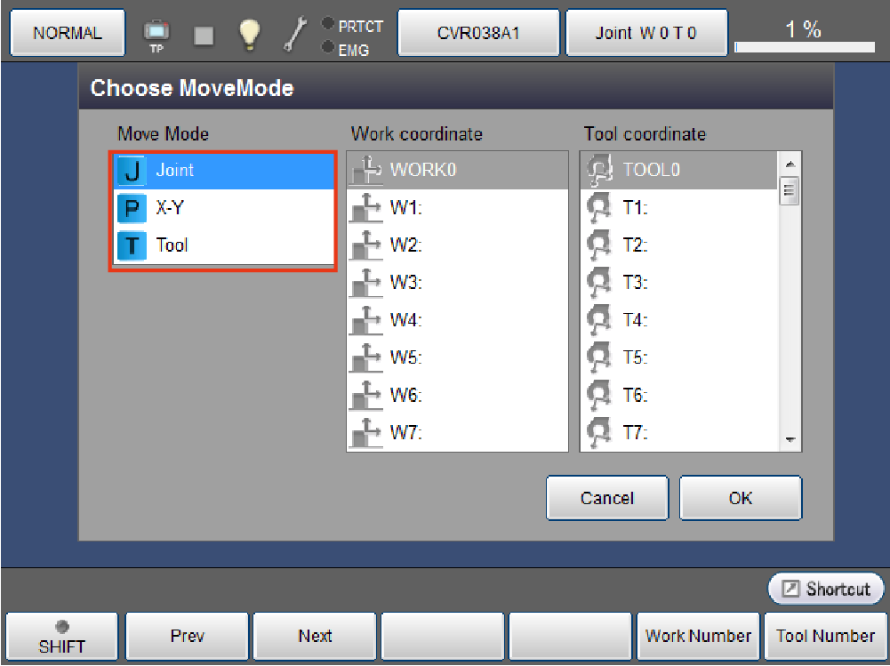 直接模式下按下[动作模式选择]的选项按钮后,画面右上方的[动作模式]按钮显示会变化。但是,不论显示何种动作模式,用户均可以相同方式移动机器人。