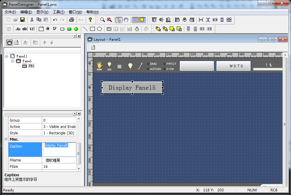 创建执行操作盘切换的按钮。此处为Panel5操作盘文件(Panel5.pns)显示按钮的创建示例。请将按钮的Caption设为易懂的名称。