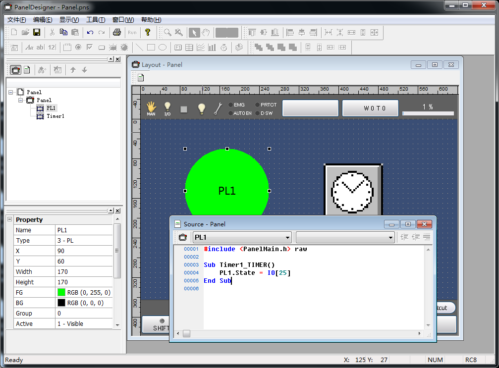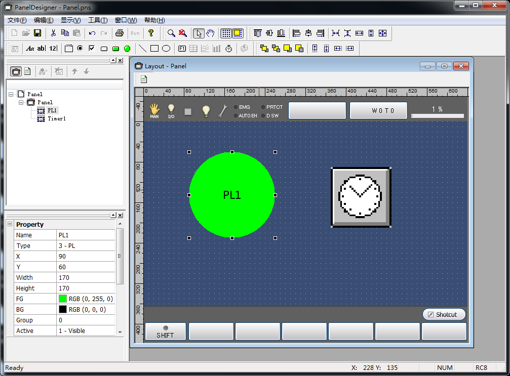 按照与按钮相同的方式启动PanelDesigner,在画面上配置1个信号灯和1个定时器。