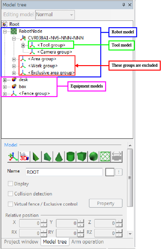 | 机器人模型 | 在Robot Node以下,除工具组、区域组、工件组、排他组以下的对象。 | - |
