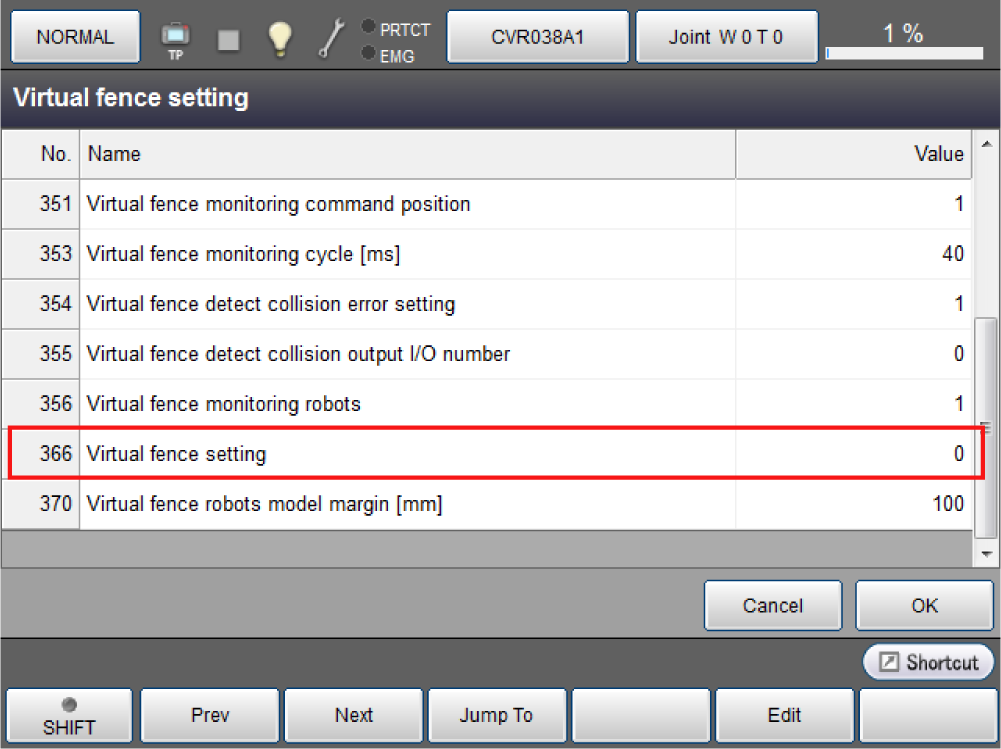 进行监视的设定。如果按[F7设定],显示各参数,因此将“366:虚拟栅栏设定”设为有效,若有必要变更其他参数的默认值。其他值的变更请按[F5编辑]。