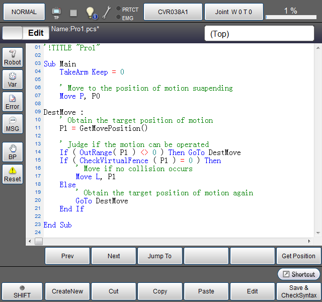 运行机器人,并且虚拟栅栏检测到机器人会与设备产生碰撞时,将会出现错误,从而机器人将会停止。但CheckVirtualFence指令的编程使其可在未运行机器人的情况下,检查在目标位置机器人是否会与设备产生碰撞,因此其能够确保机器人不会因为错误而停止,实现了持续运行。