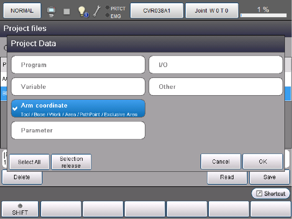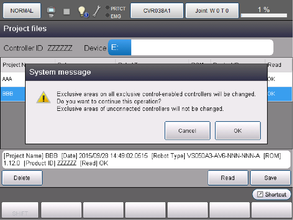 选择了[机械臂坐标系]时,读入开始前出现警告对话框。如果按[OK],读入保存在USB存储器中的项目。读入完成后,重启COBOTTA。
