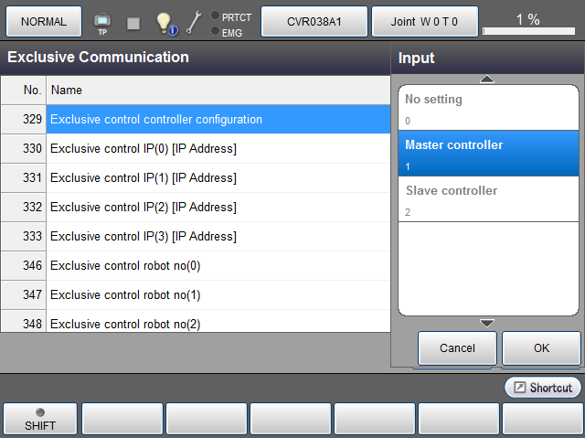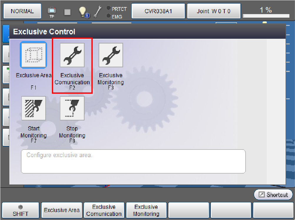 操作路径:基本画面 - [F2 机械臂] - [F6 辅助功能] - [F11 排他控制] - [F2 排他通信设定]
